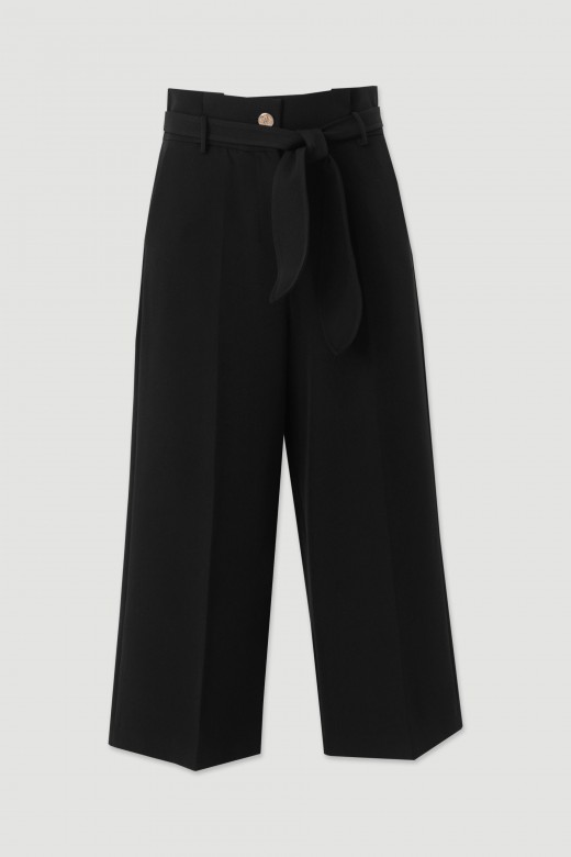 Calça culotte feminina de corte wide leg, com cintura subida. Apresenta pregas frontais que conferem elegância e um cair fluido. Inclui cinto no mesmo tecido para ajuste e definição da cintura, com presilhas e fecho frontal discreto.