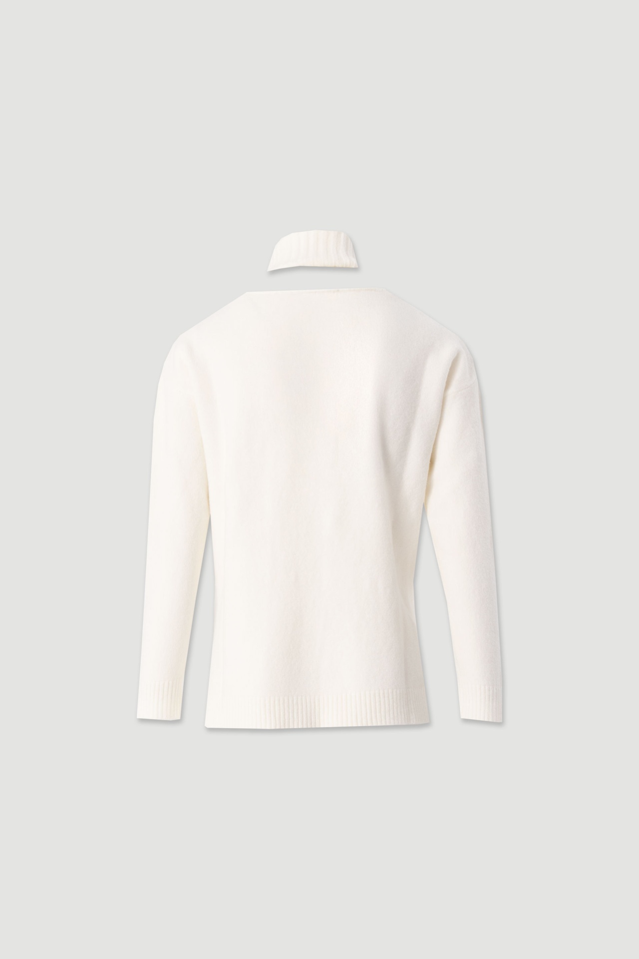Camisola de malha de toque suave, com corte direito. Decote em V e gola alta canelada. Manga comprida e acabamentos canelados nos punhos e na baínha, que garantem um ajuste cuidado e estruturado.