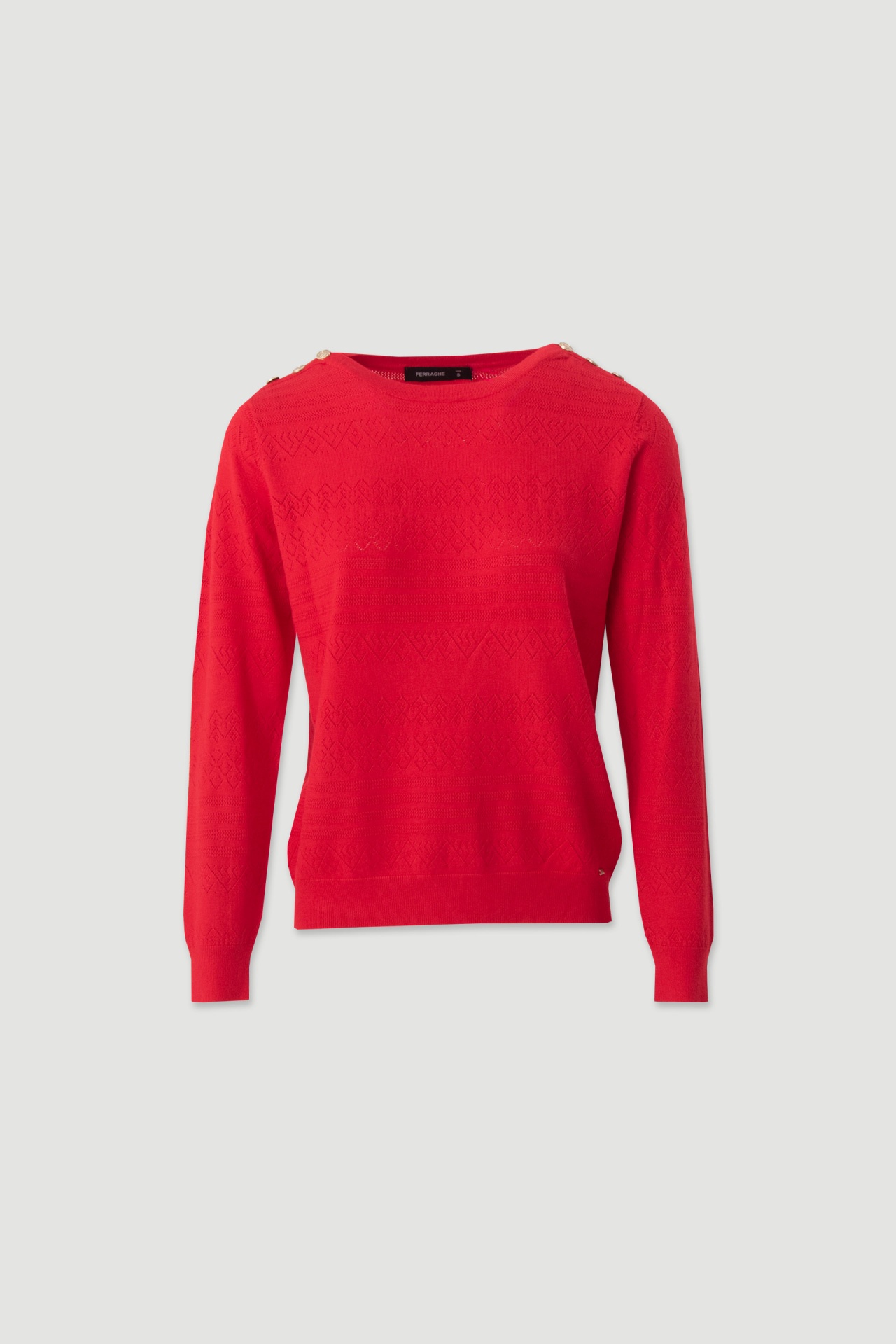 Camisola feminina em malha leve e confortável, com padrão subtil trabalhado que acrescenta textura e elegância à peça. Modelo de corte direito, com decote redondo e manga comprida. O destaque vai para os botões metálicos decorativos aplicados nos ombros, que conferem um toque sofisticado e diferenciador. Acabamentos canelados no decote, punhos e bainha, garantindo um ajuste cuidado e confortável. Ideal para looks elegantes e versáteis no dia a dia.
