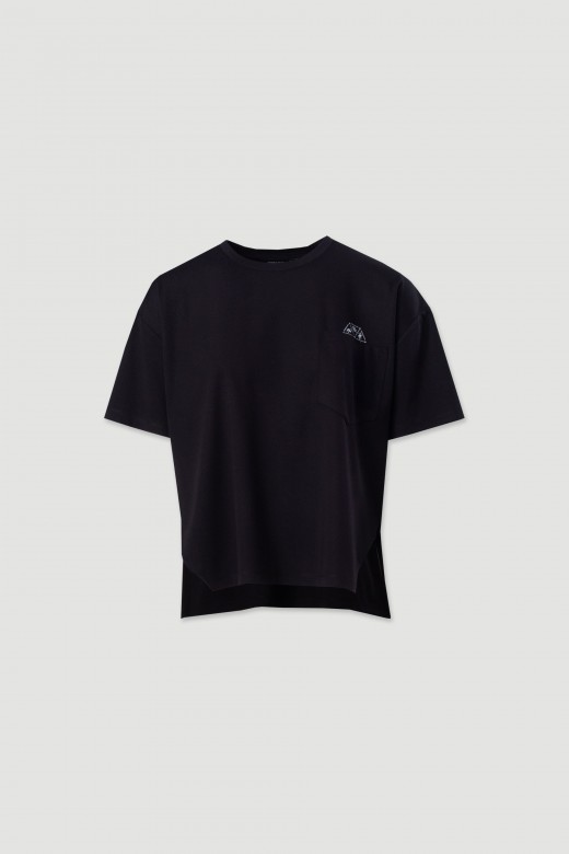 T-shirt em malha com decote redondo e ombro descaído, para um fit descontraído e confortável. Manga curta e bolso no peito com estampado, que acrescenta um toque moderno. Acabamento com rachas laterais.