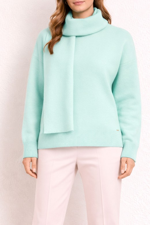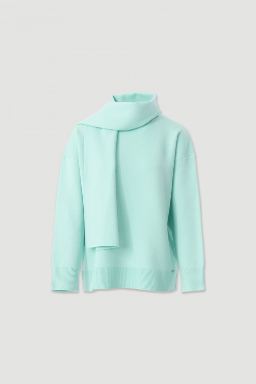 Camisola de malha com design original e sofisticado, com efeito cachecol integrado e preso na parte de trás. Modelo de corte confortável, com manga comprida e acabamentos canelados, ideal para um look elegante e moderno nos dias mais frescos.