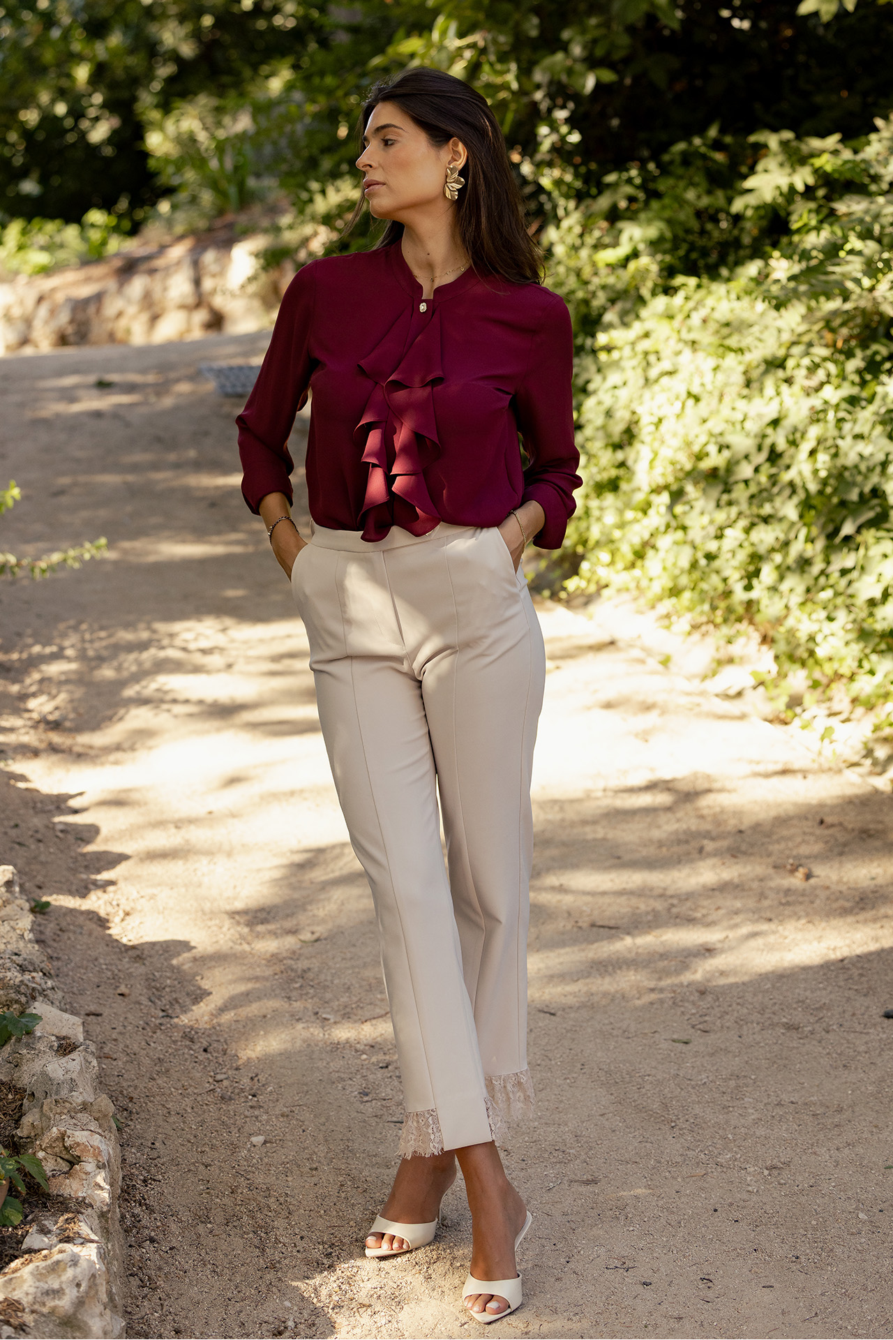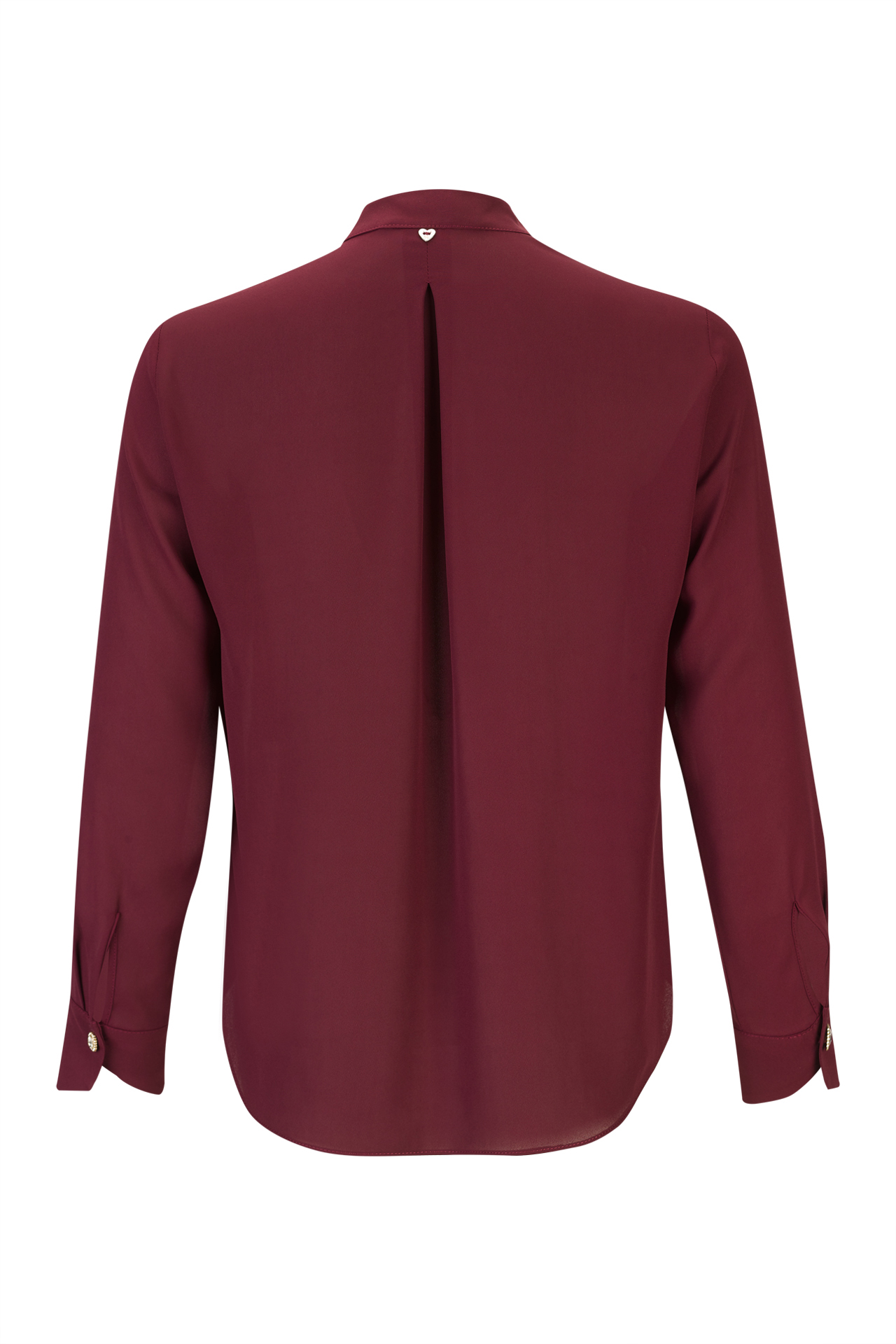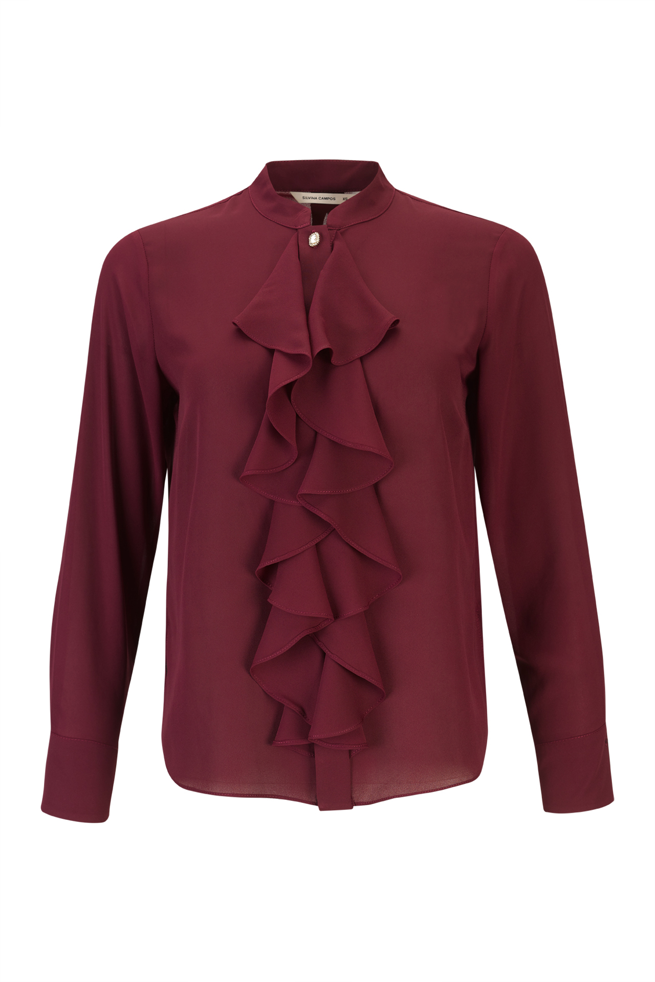 O folho central em cascata domina a frente da peça, criando profundidade e evocando o romantismo característico dos tempos vitorianos. A gola mandarim, minimalista e elegante, é valorizada por um botão com brilhantes, detalhe que se repete subtil mas distintamente nos punhos, conferindo um toque de luz que contrasta de forma requintada com o tom profundo do bordô.